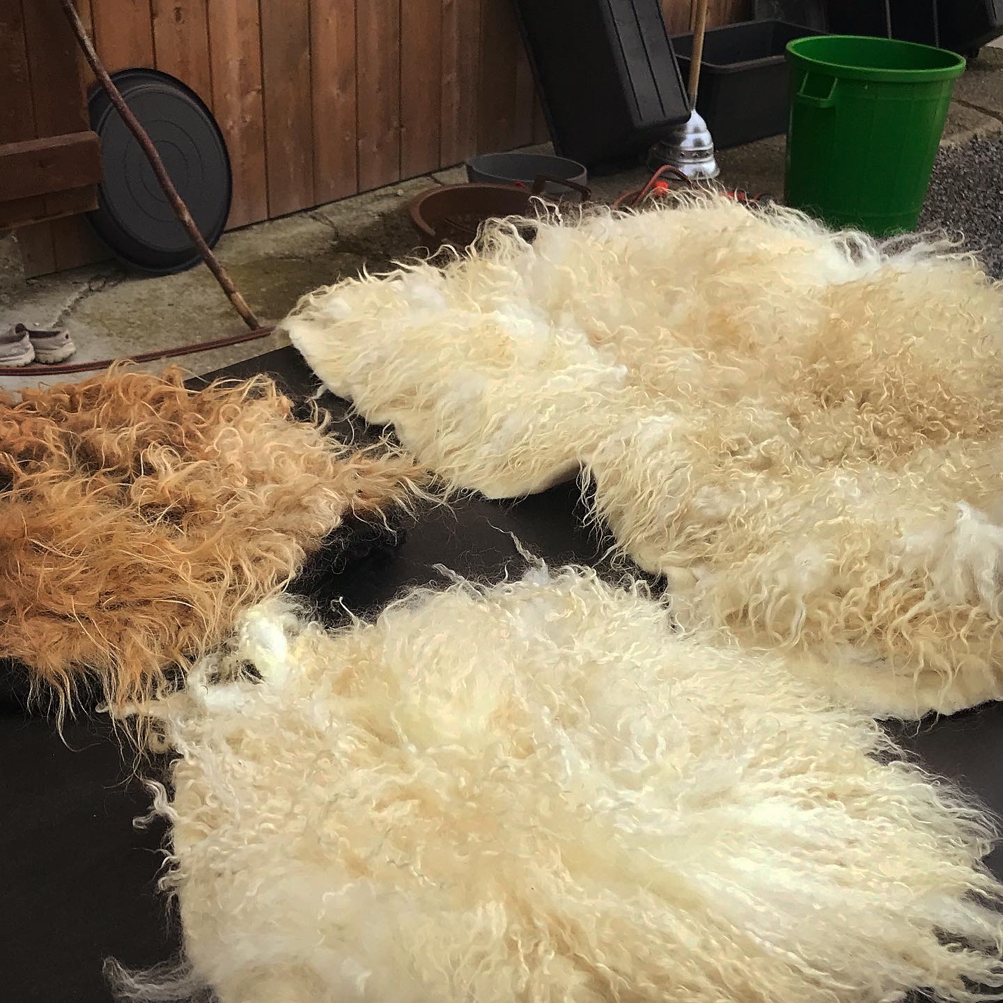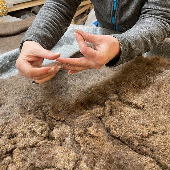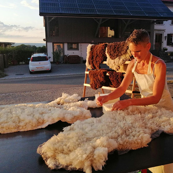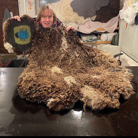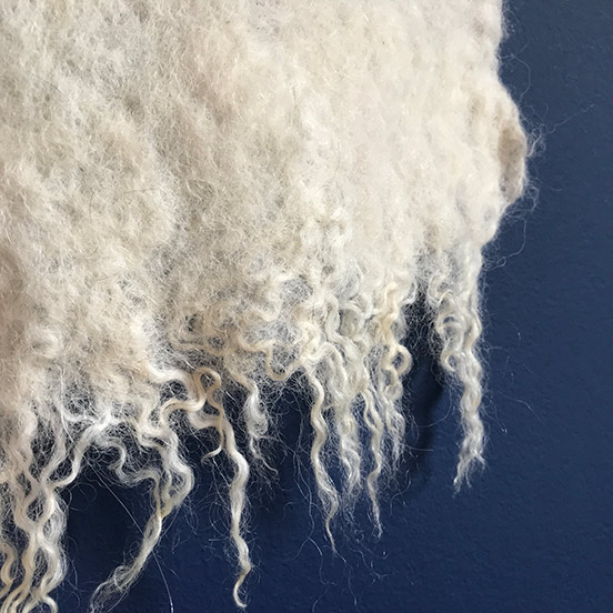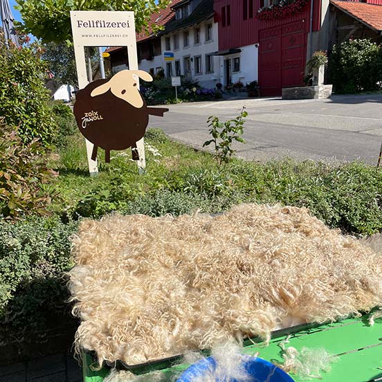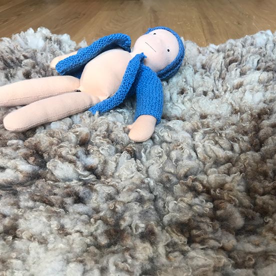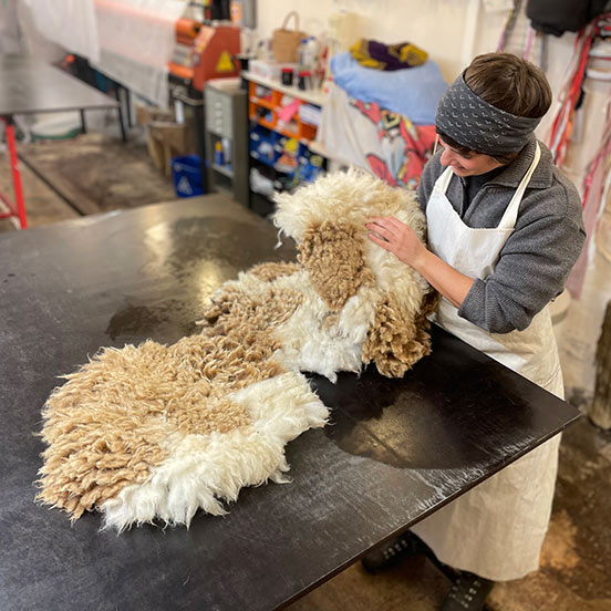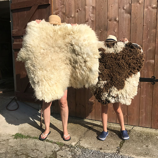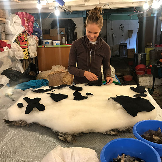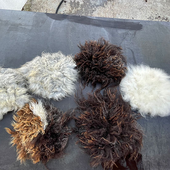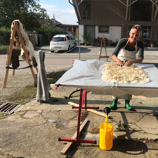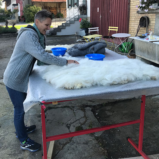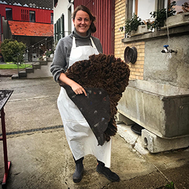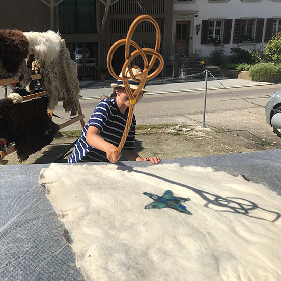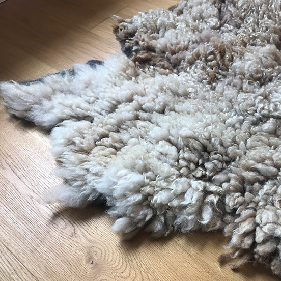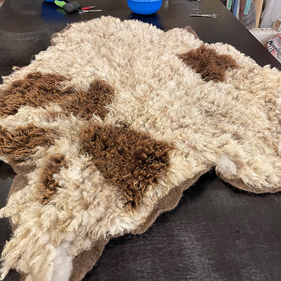 Ein grosses Schafwollfell mit Walliser Schwarznasenlocken filzen.