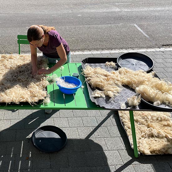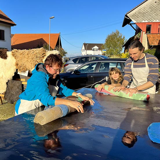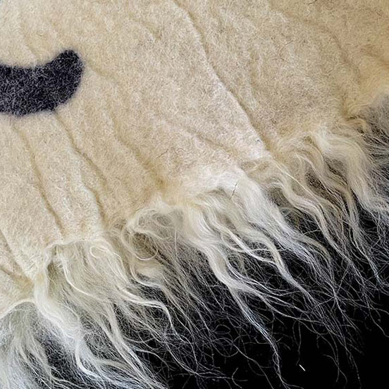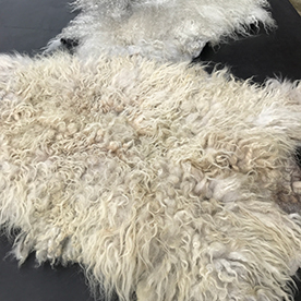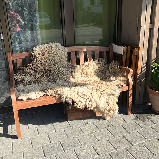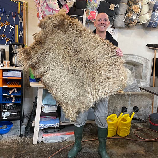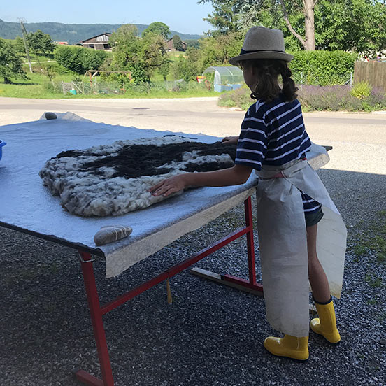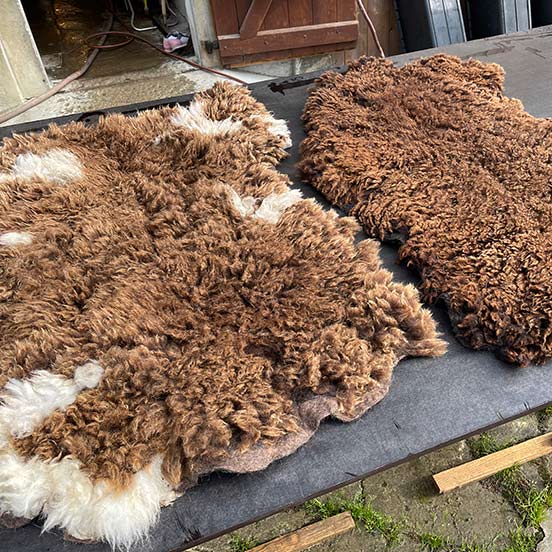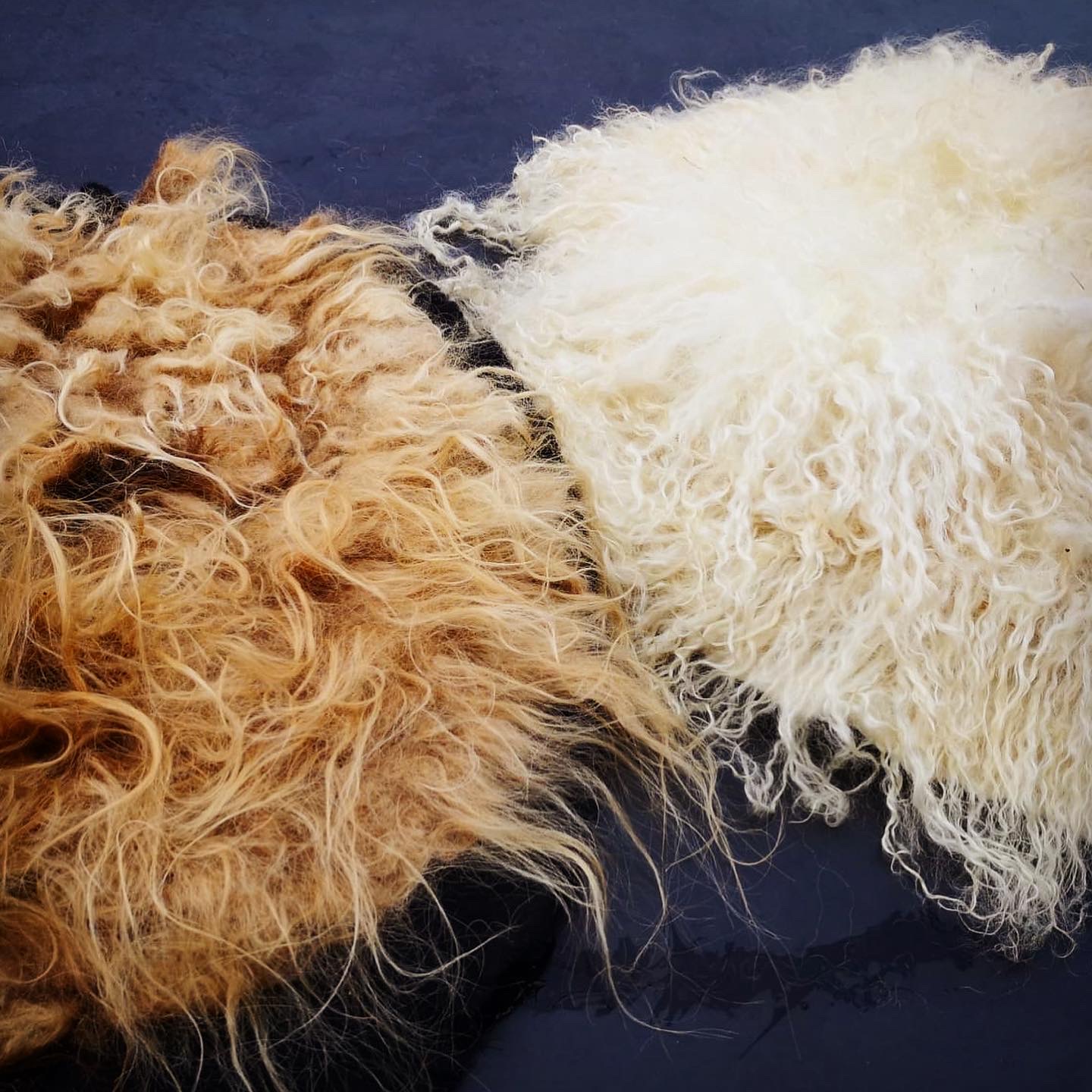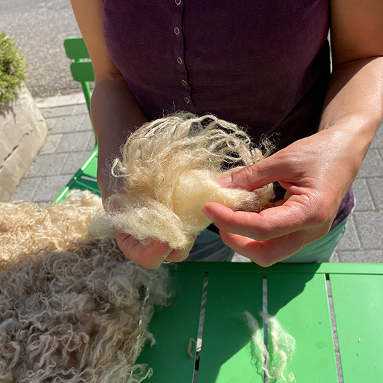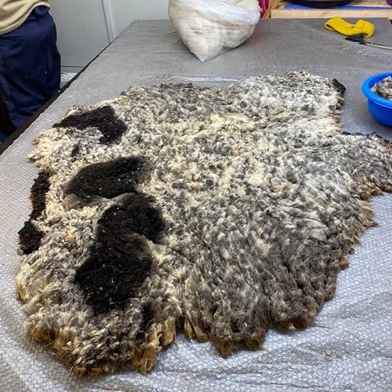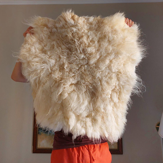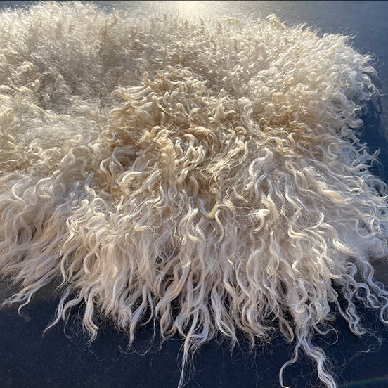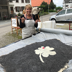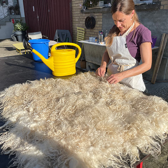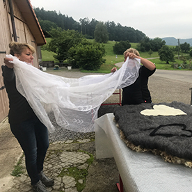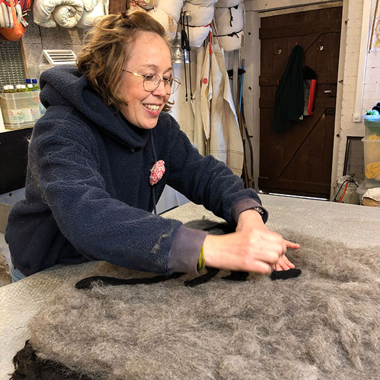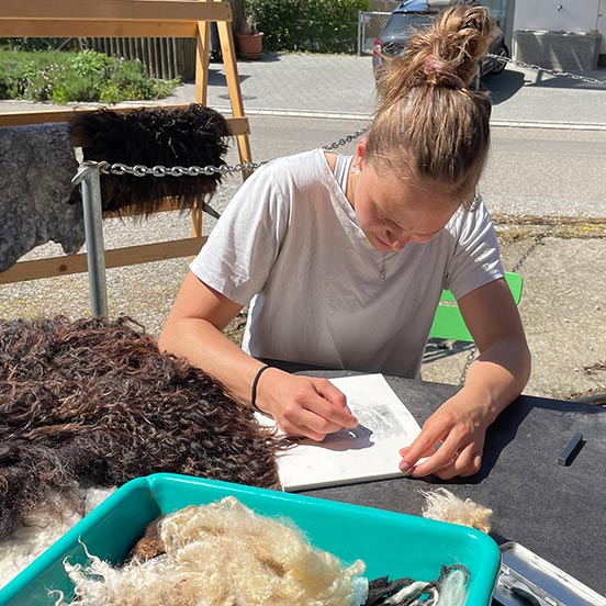 Ein grosses Schafwollfell mit Walliser Schwarznasenlocken filzen.