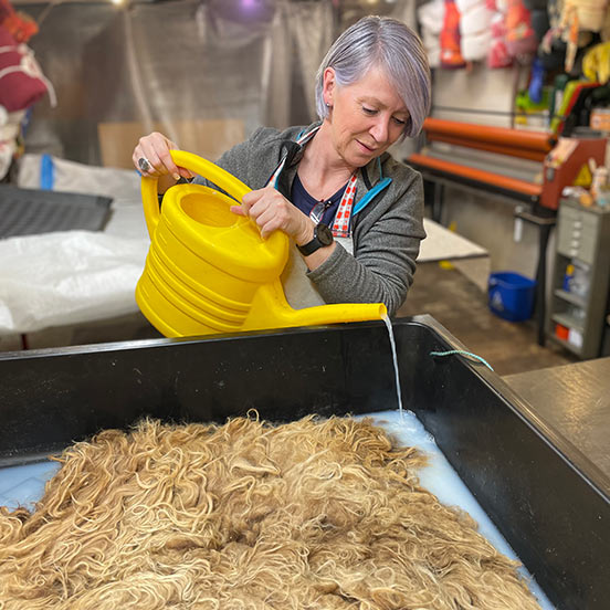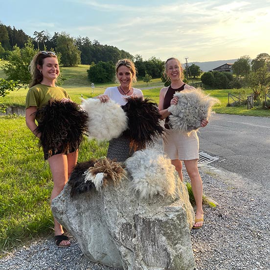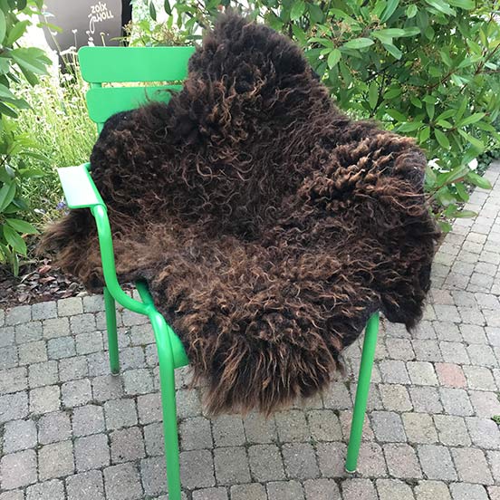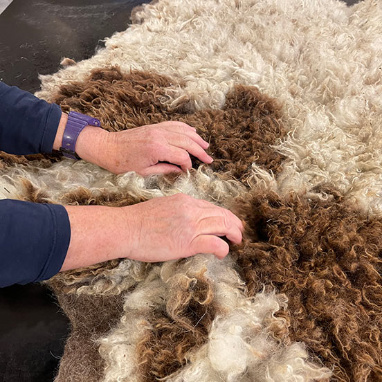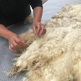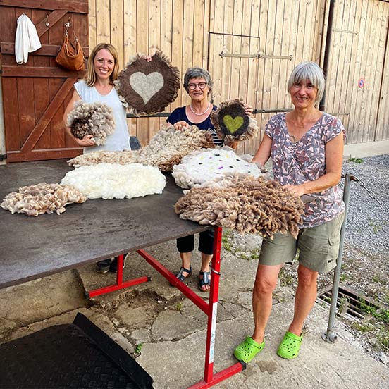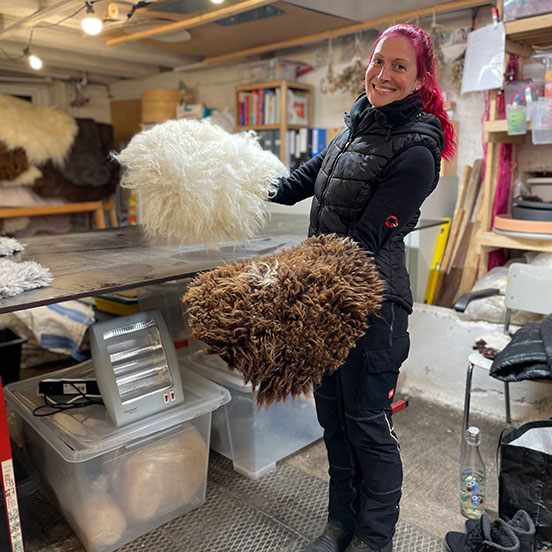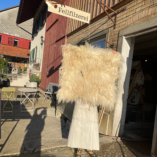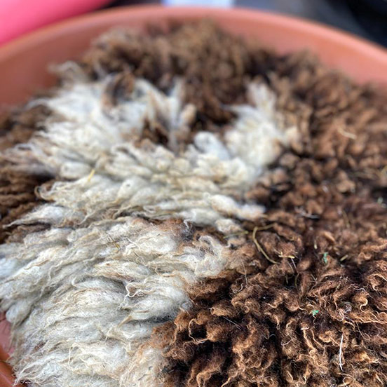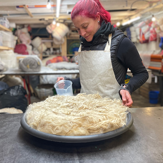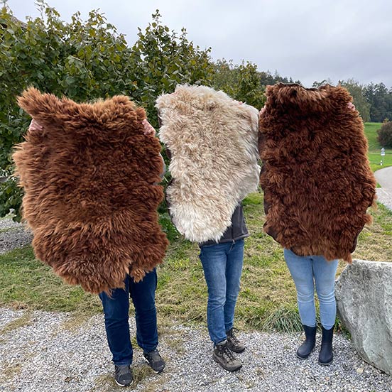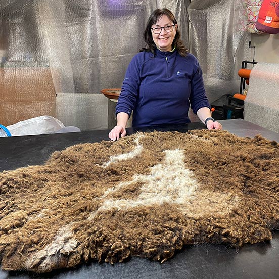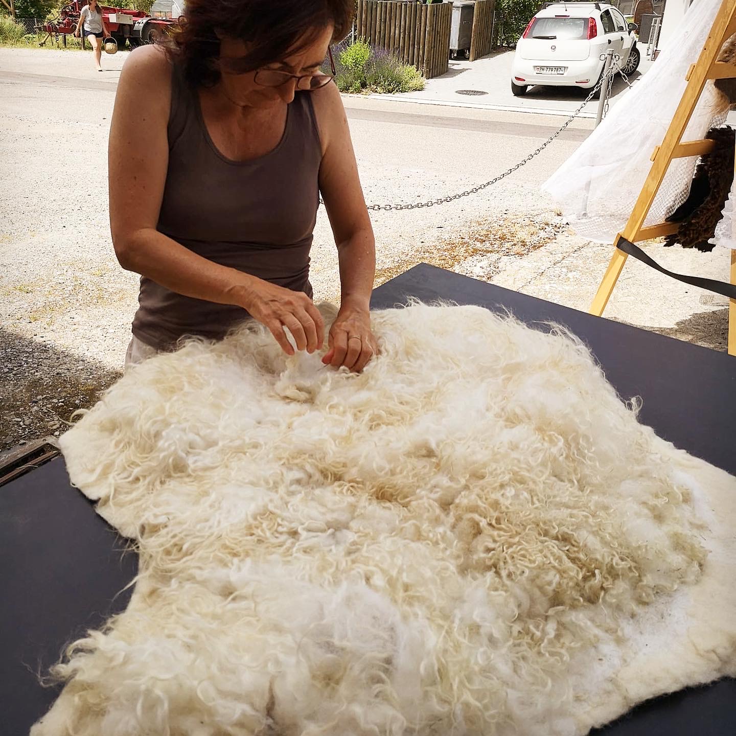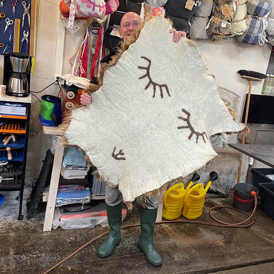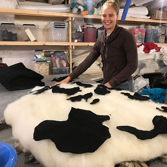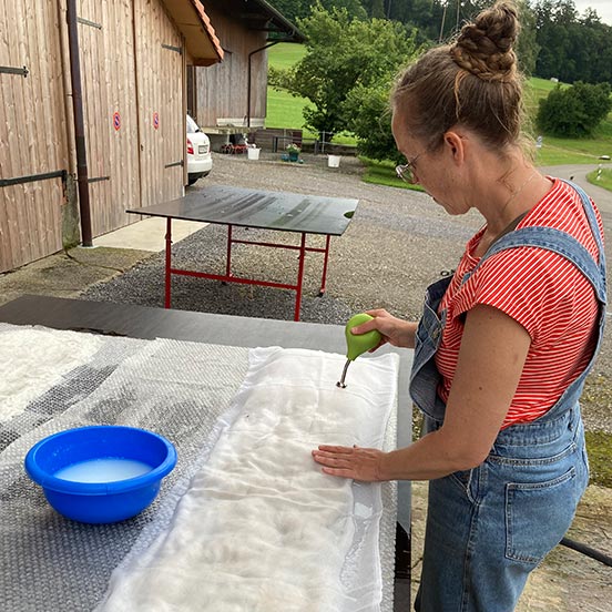 Ein grosses Schafwollfell mit Walliser Schwarznasenlocken filzen.