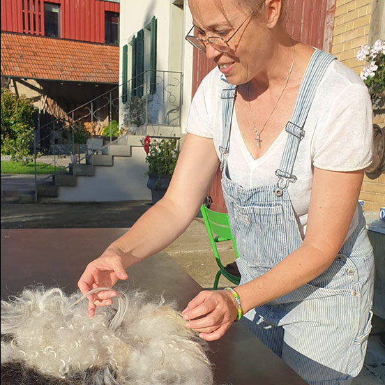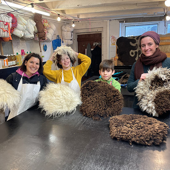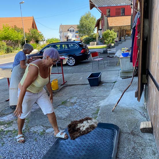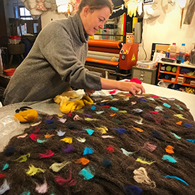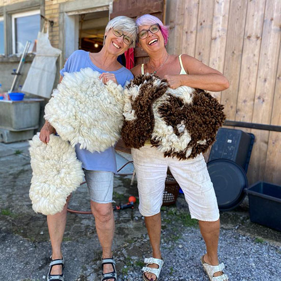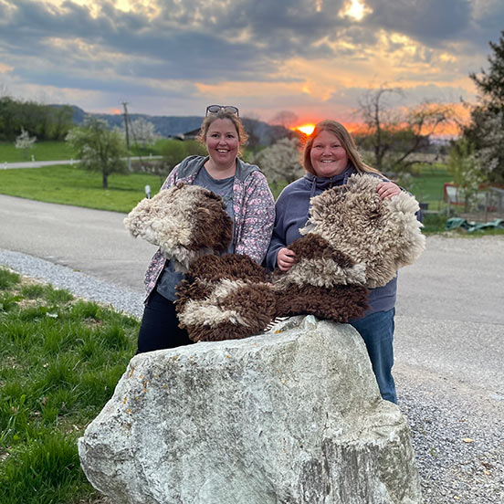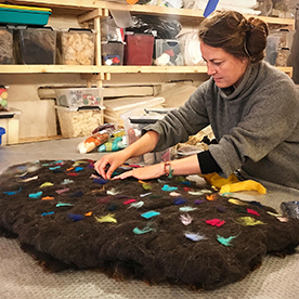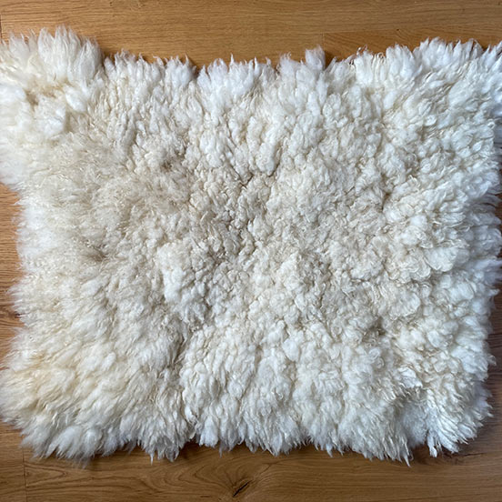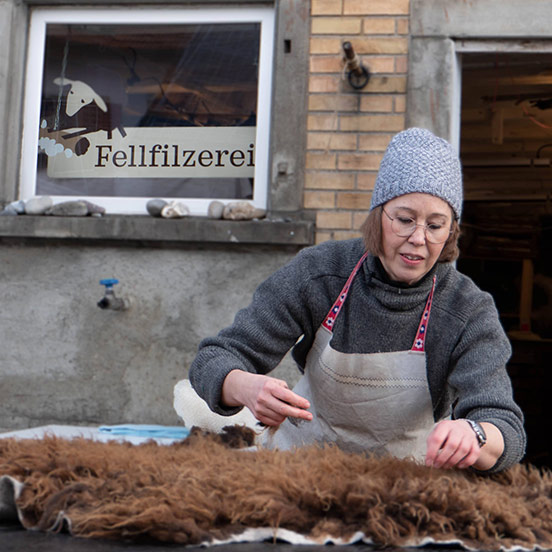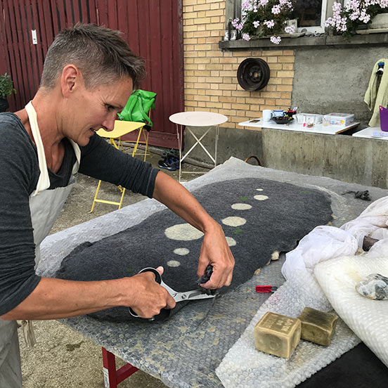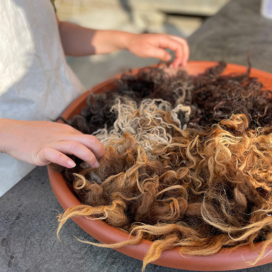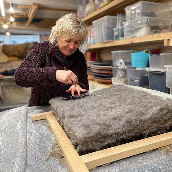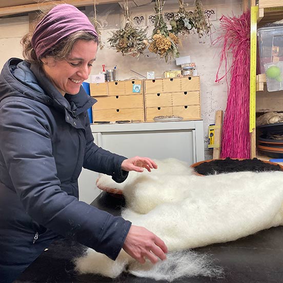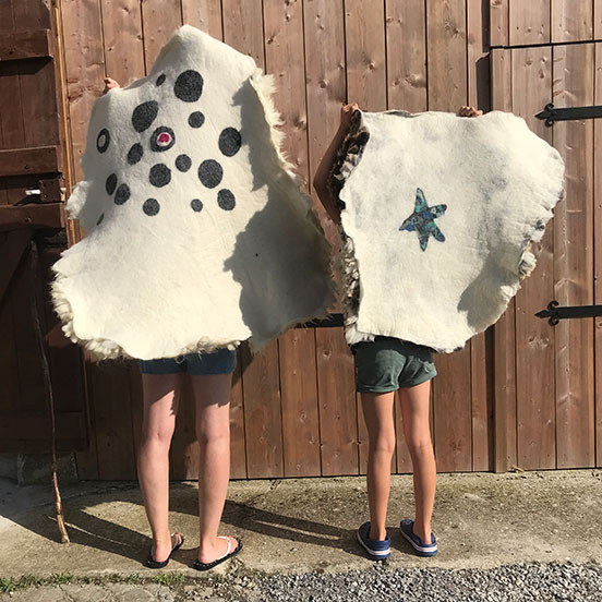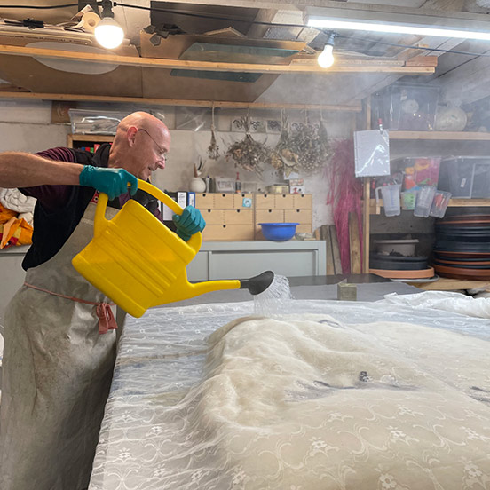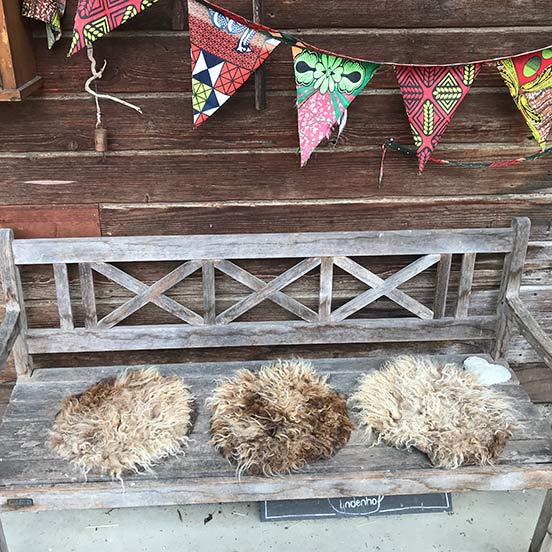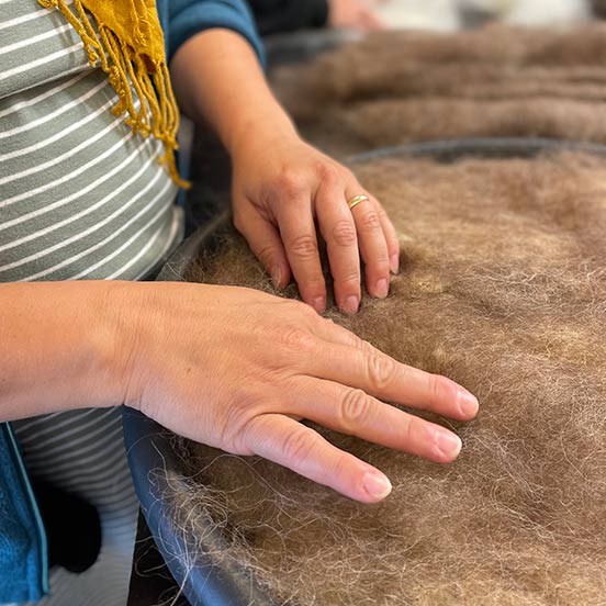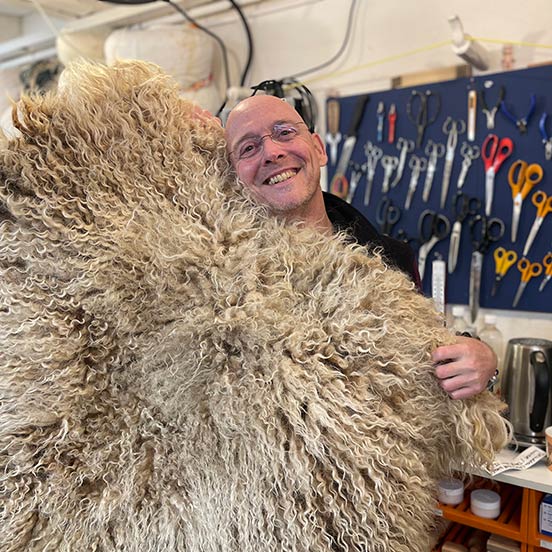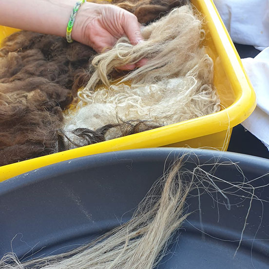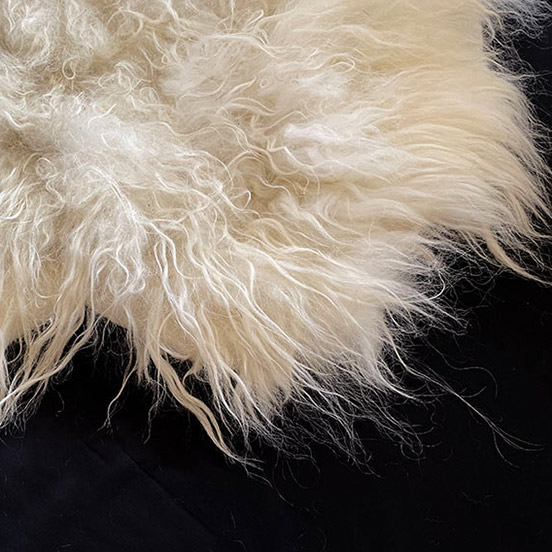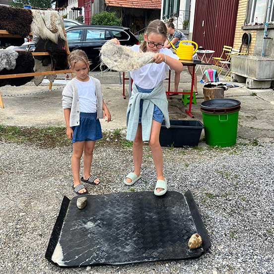 Ein grosses Schafwollfell mit Walliser Schwarznasenlocken filzen.