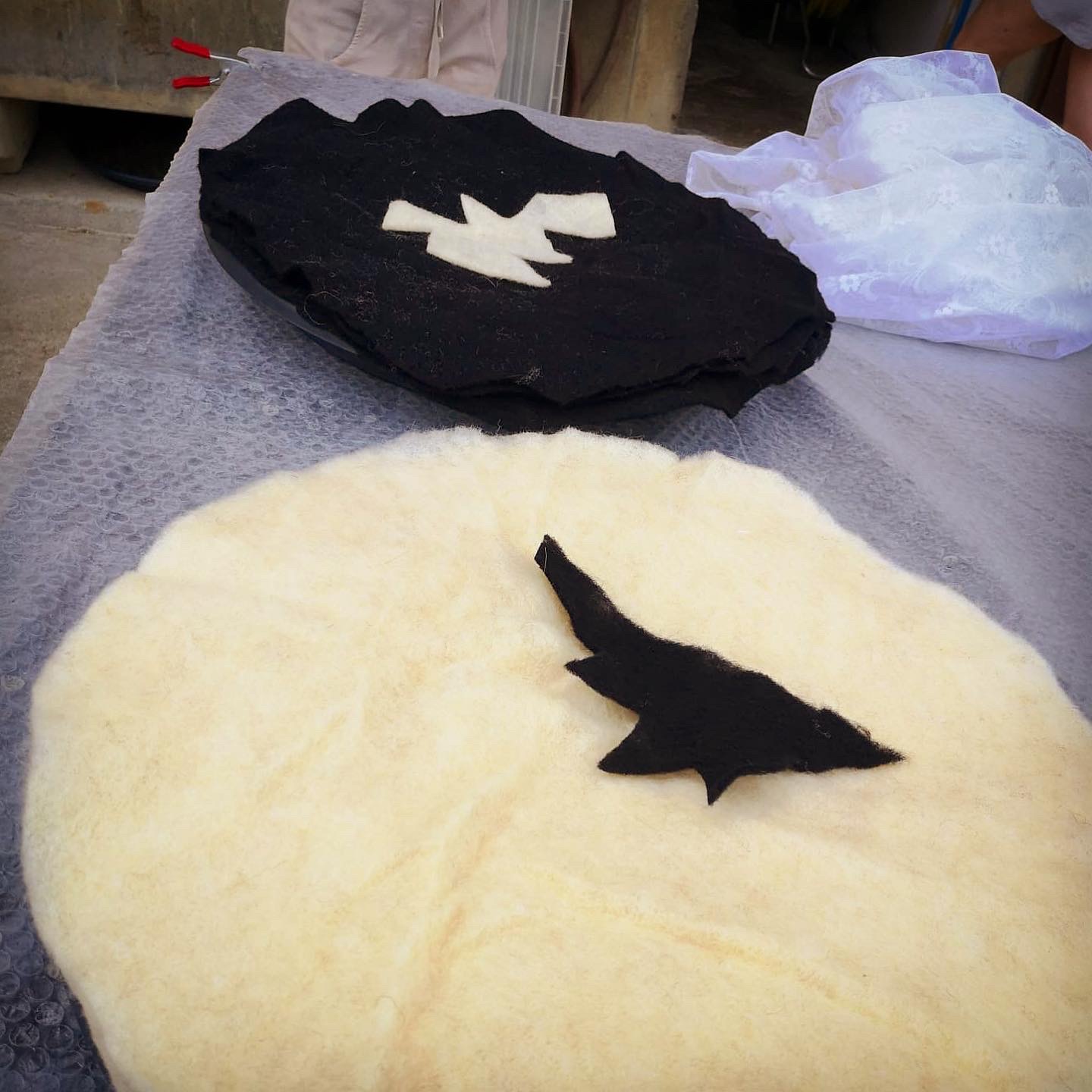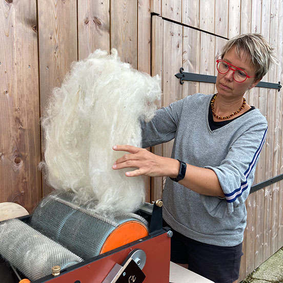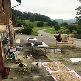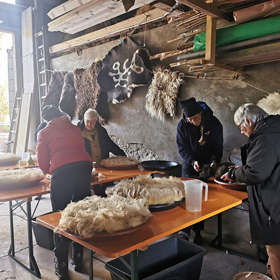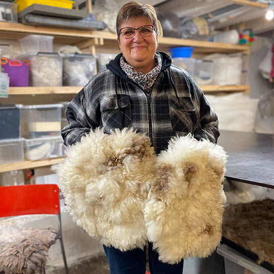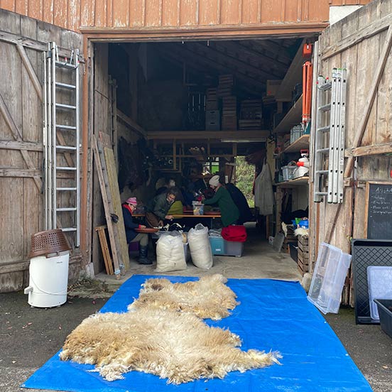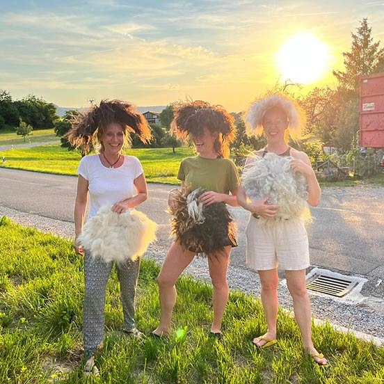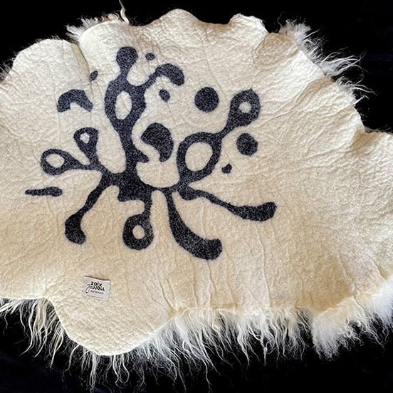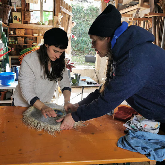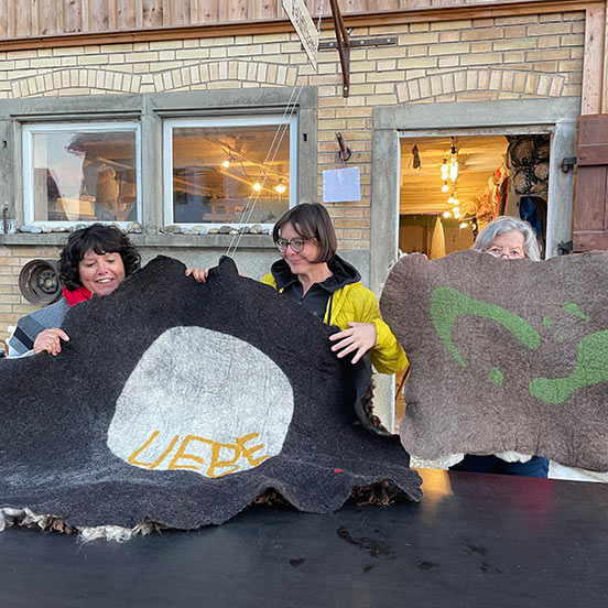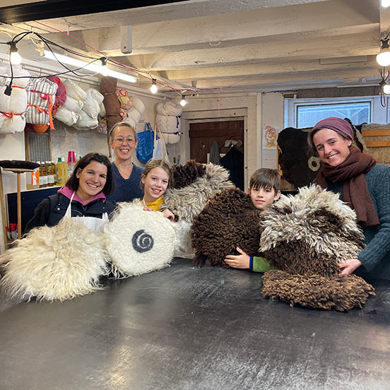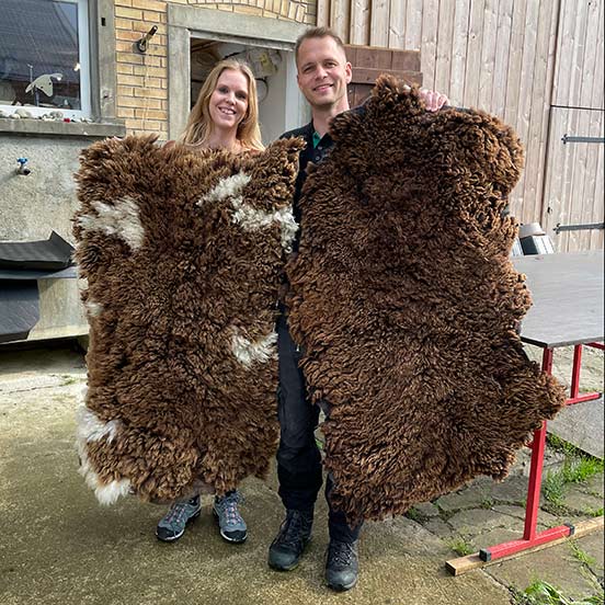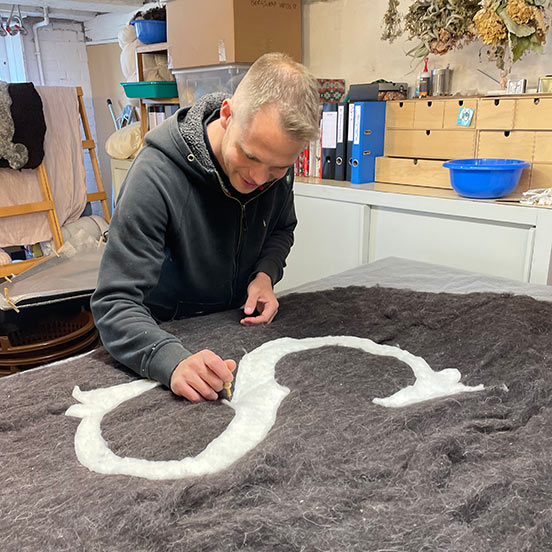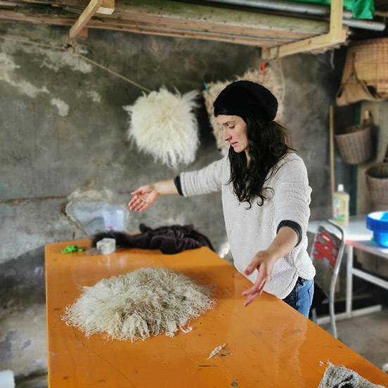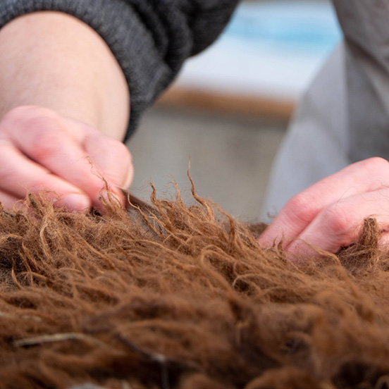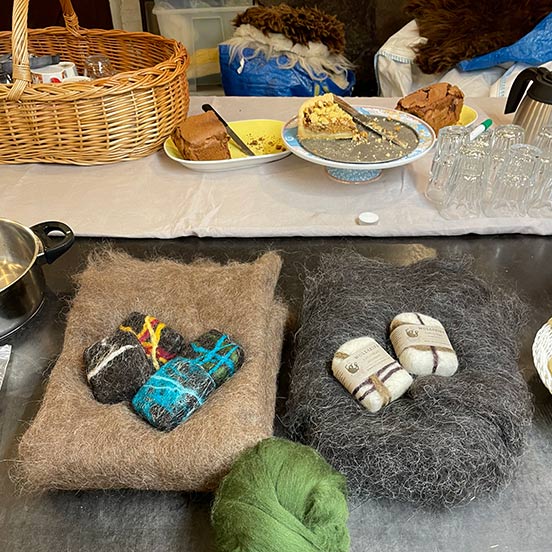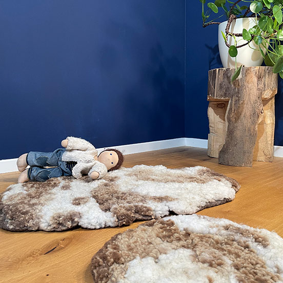 Ein grosses Schafwollfell mit Walliser Schwarznasenlocken filzen.
