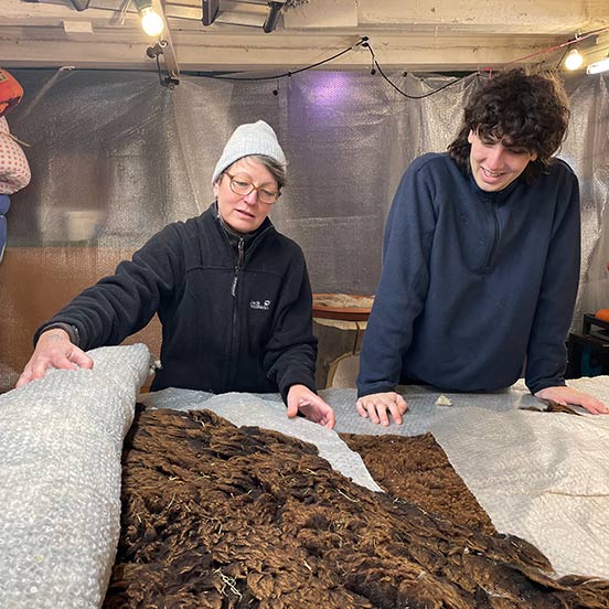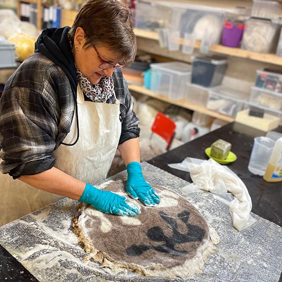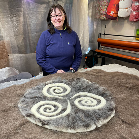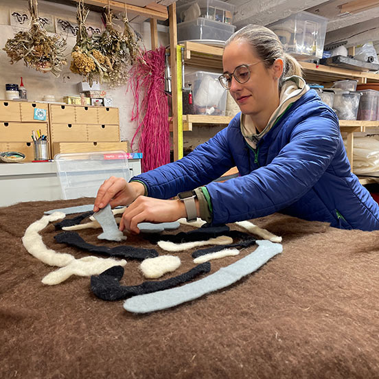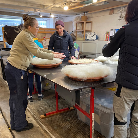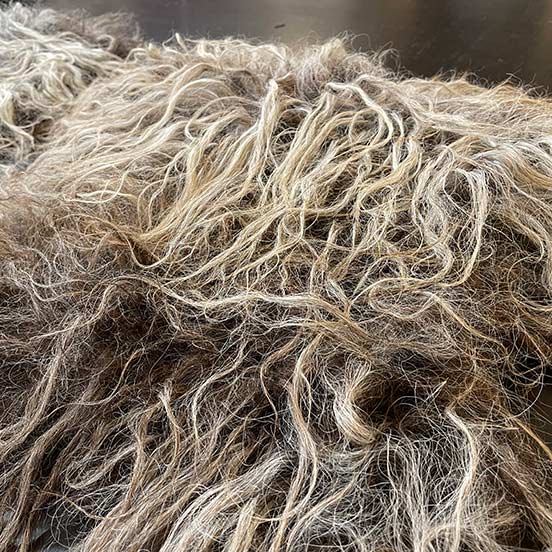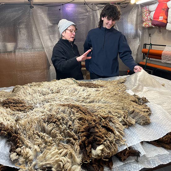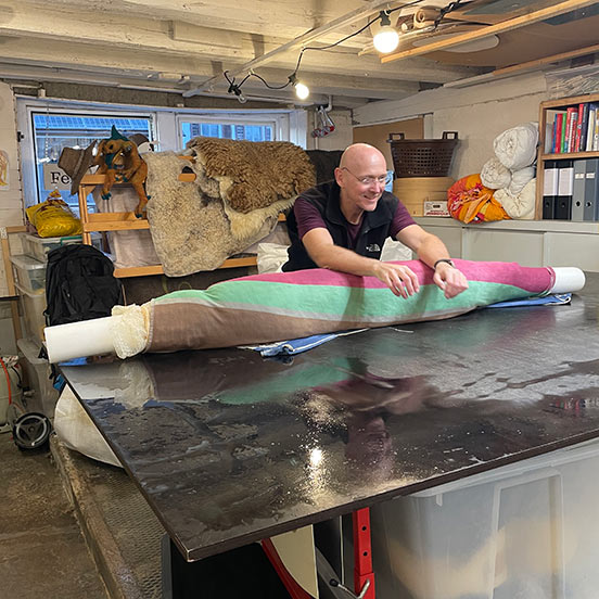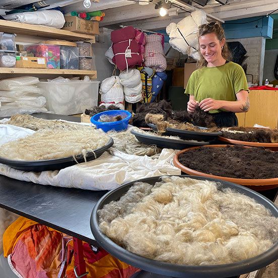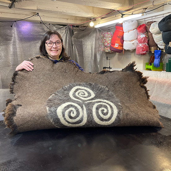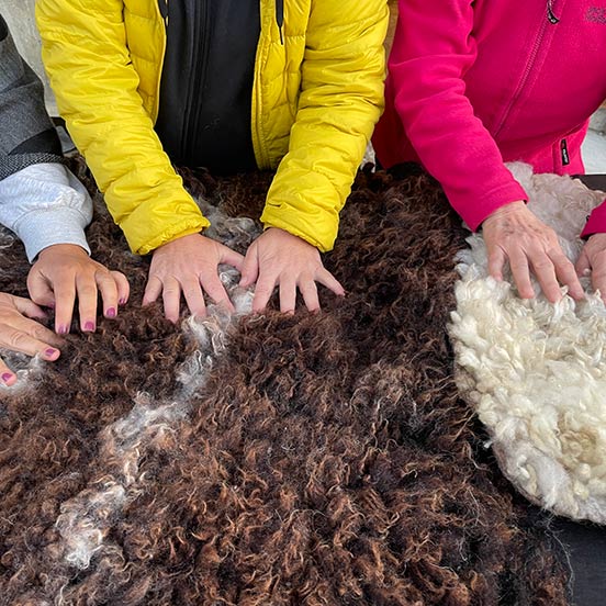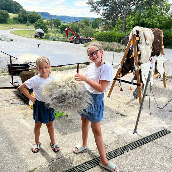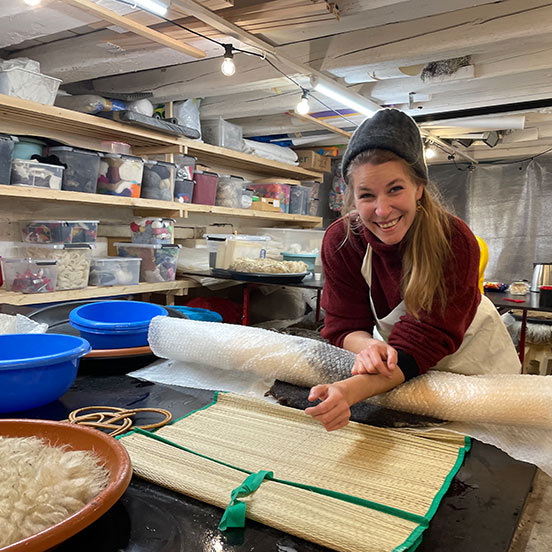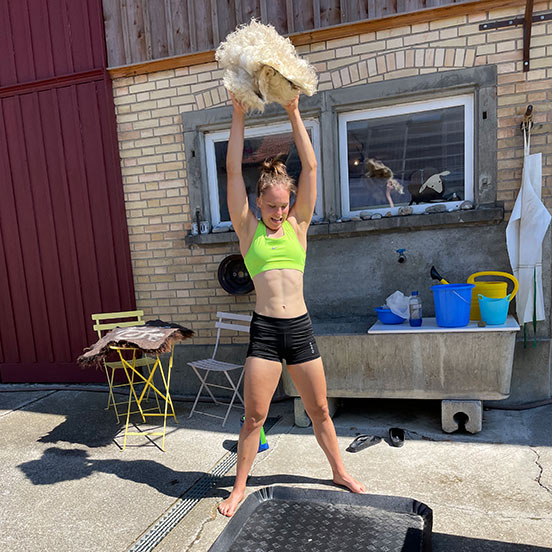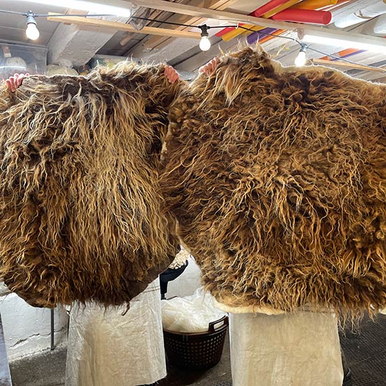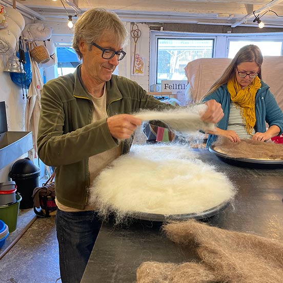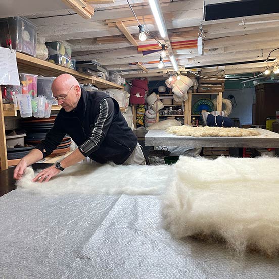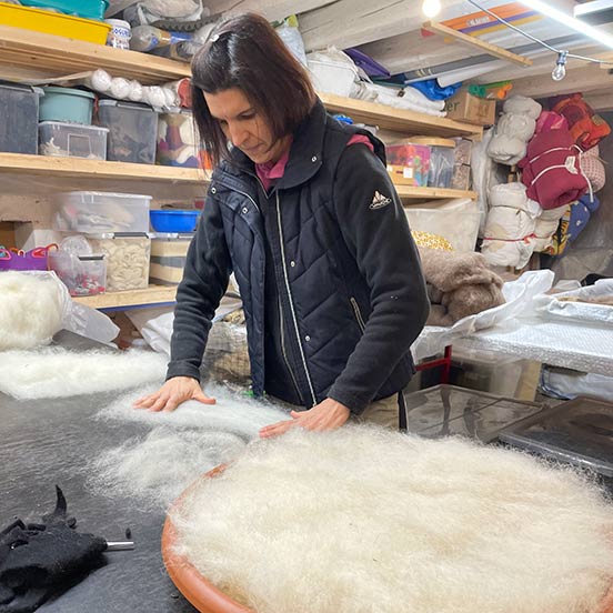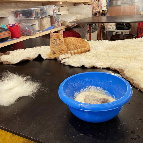 Ein grosses Schafwollfell mit Walliser Schwarznasenlocken filzen.