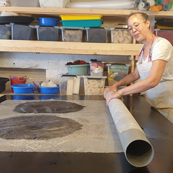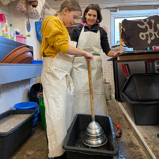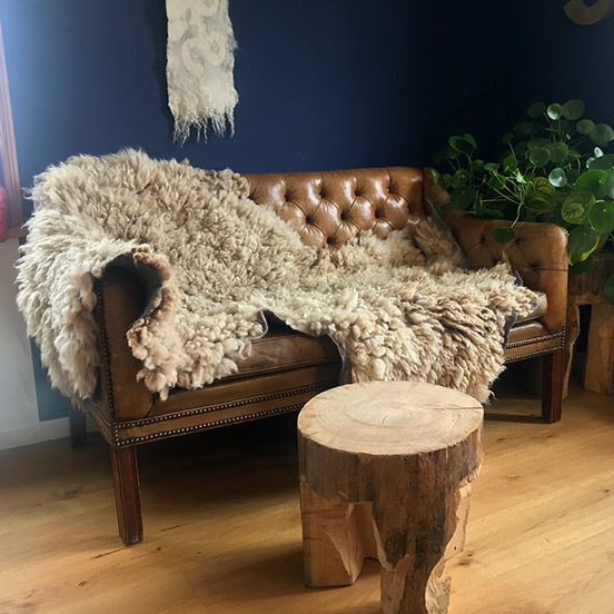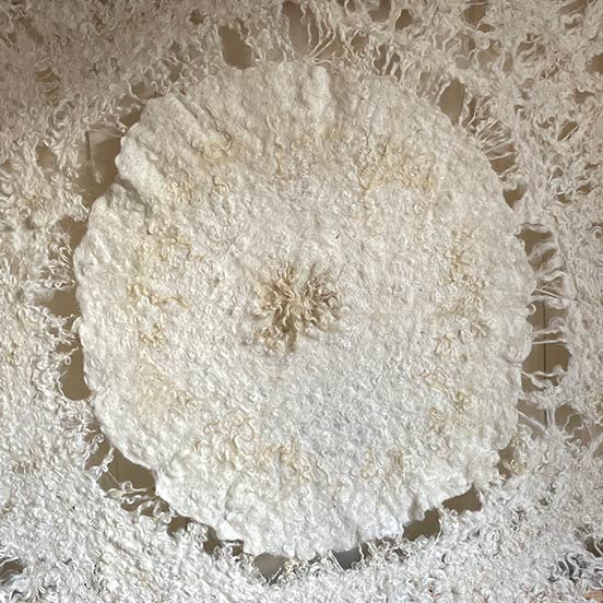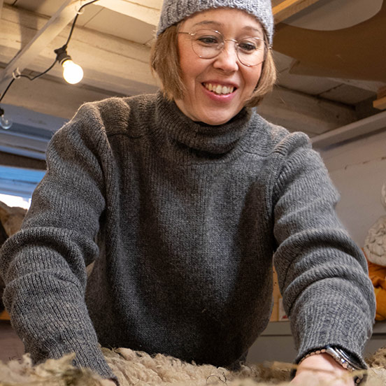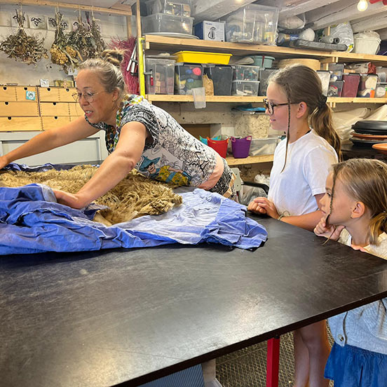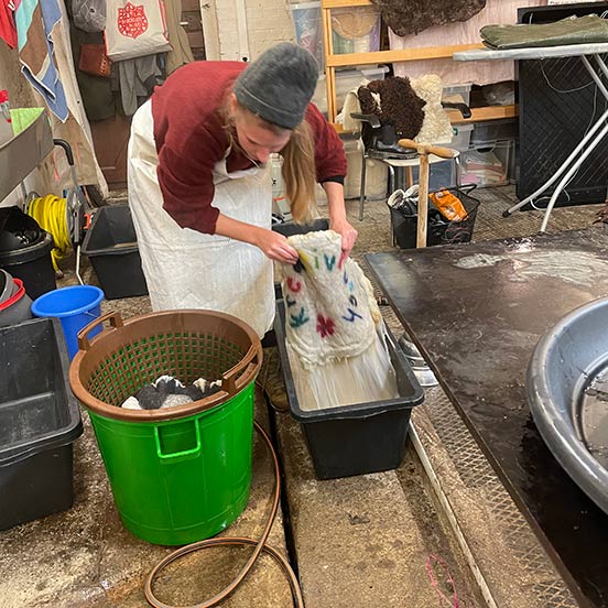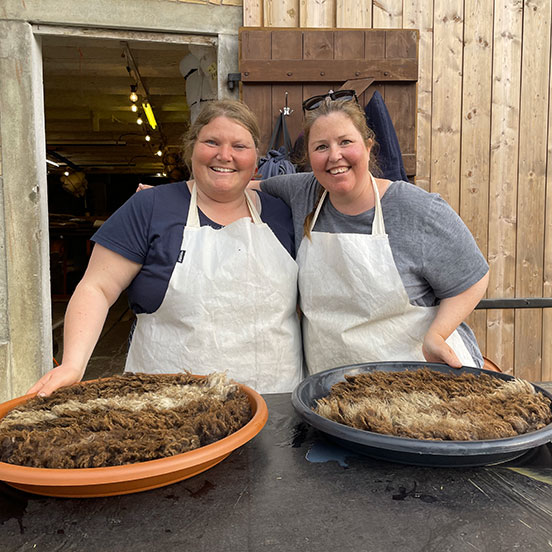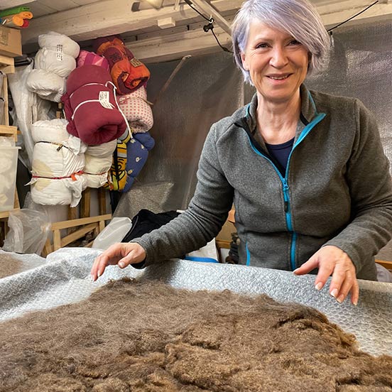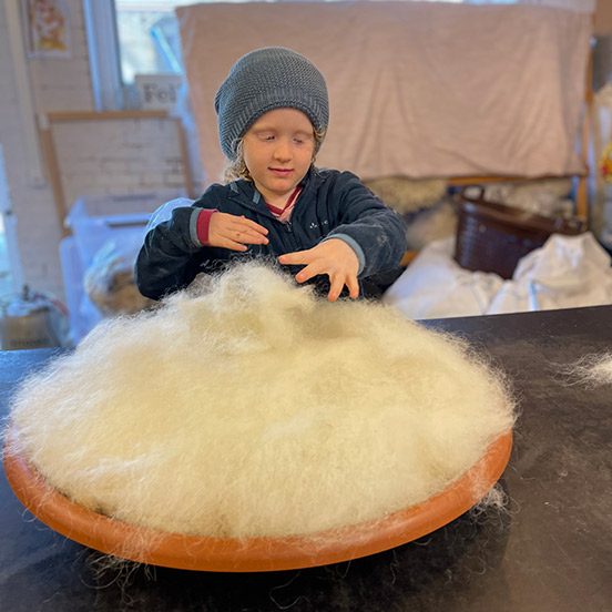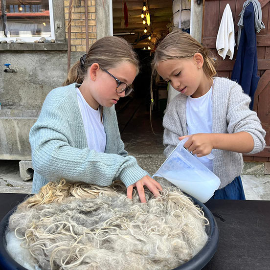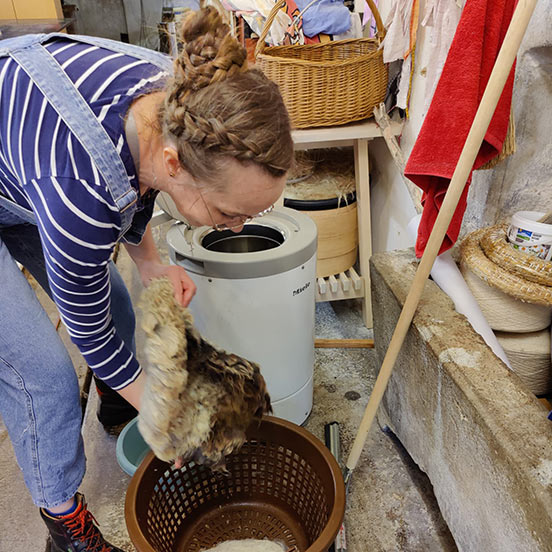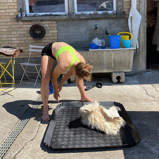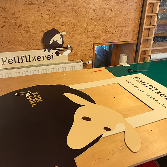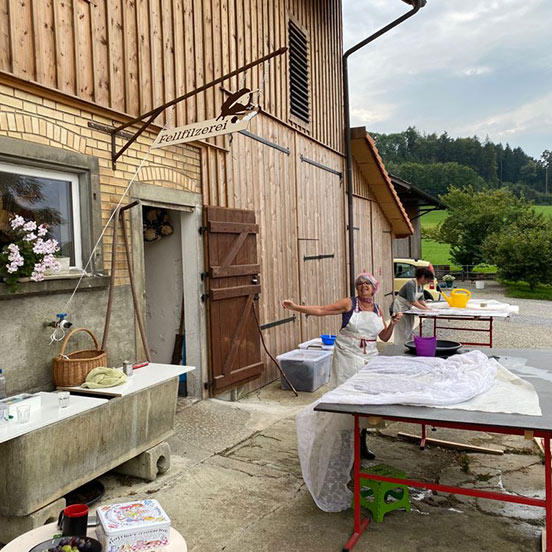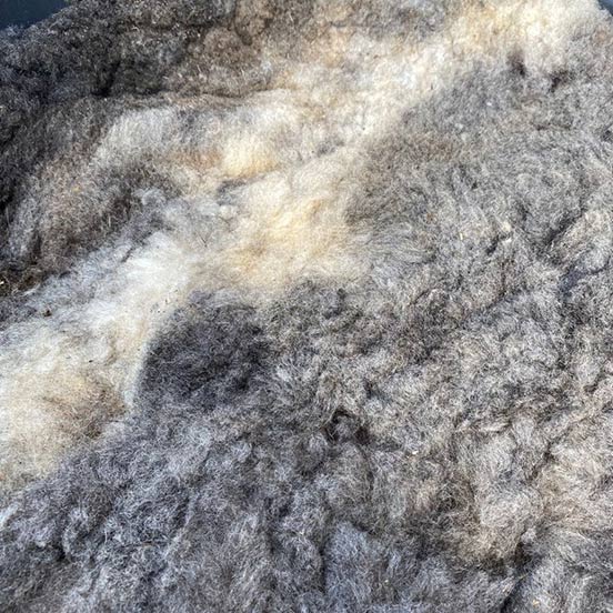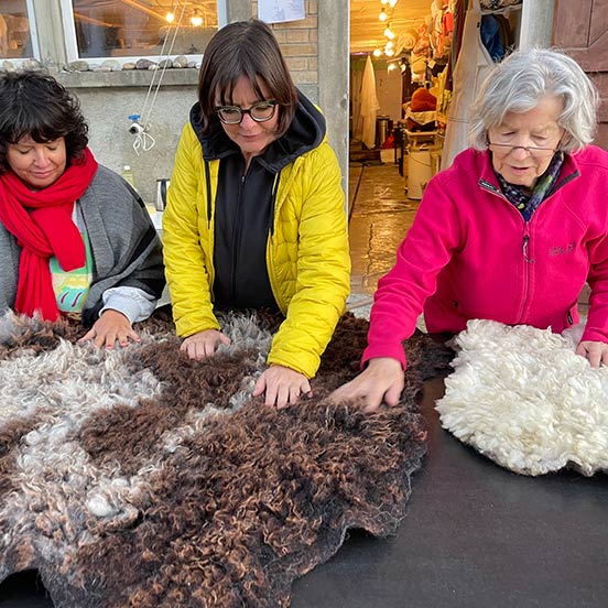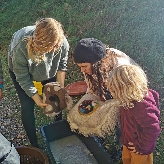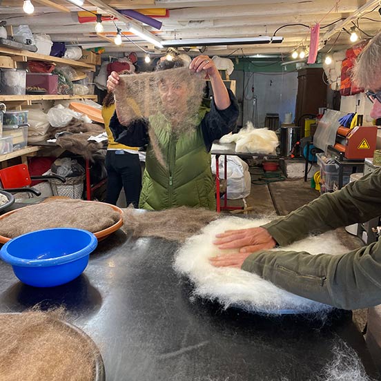Ein grosses Schafwollfell mit Walliser Schwarznasenlocken filzen.