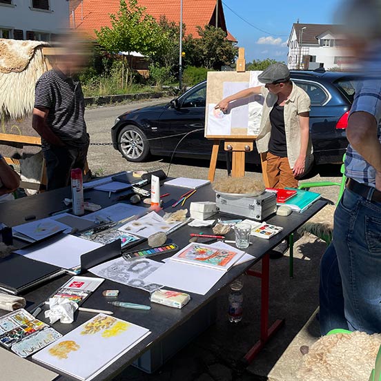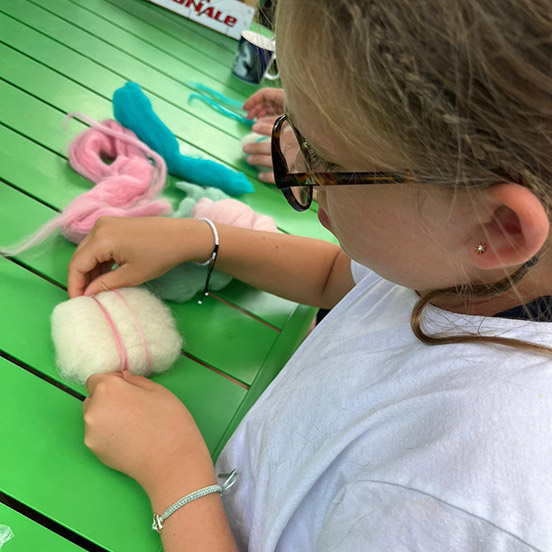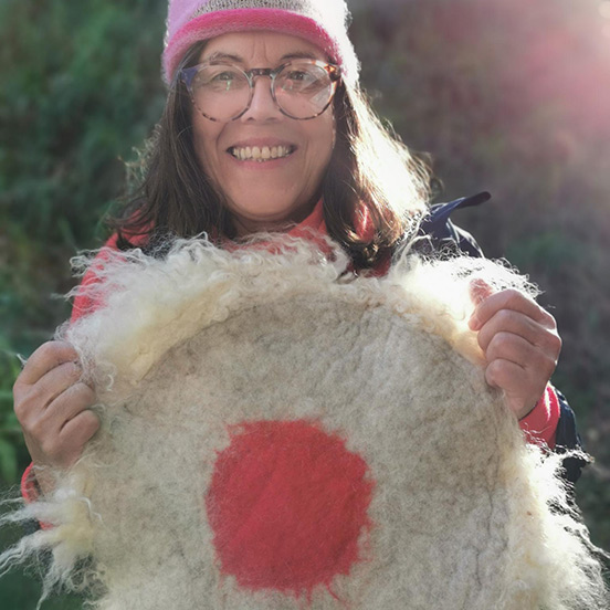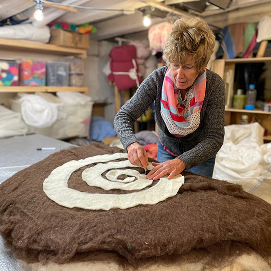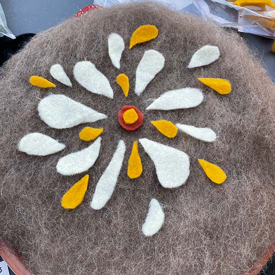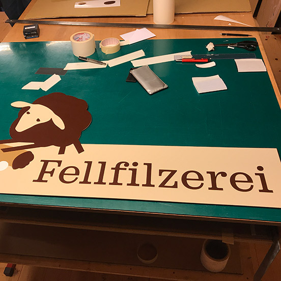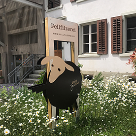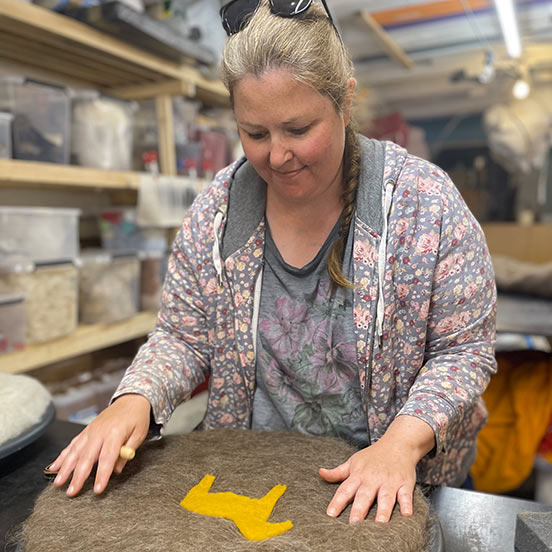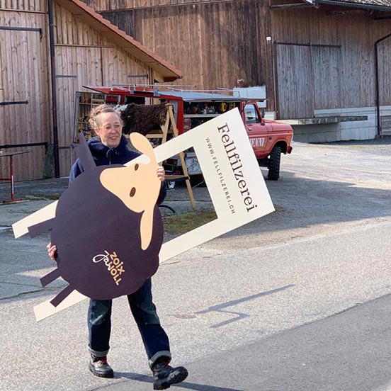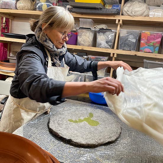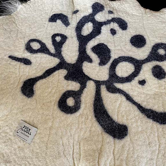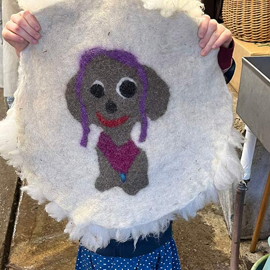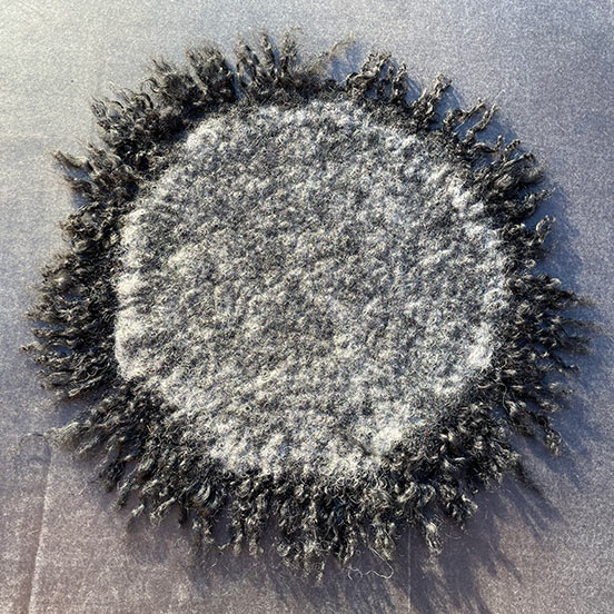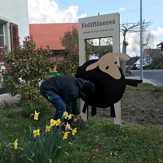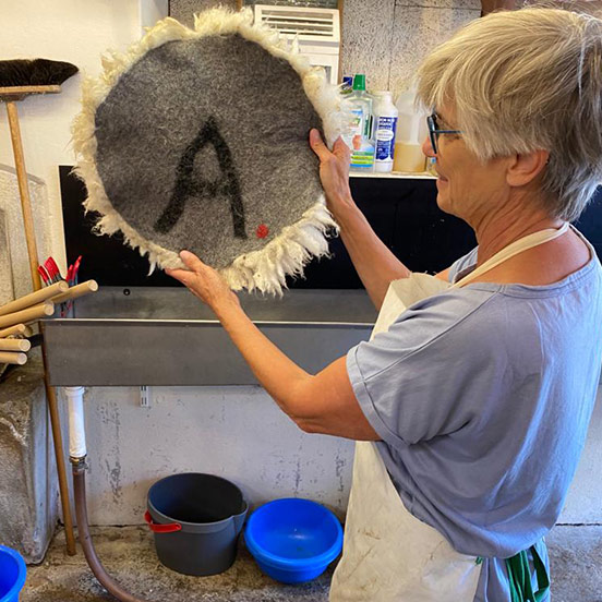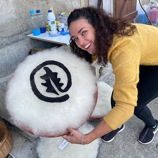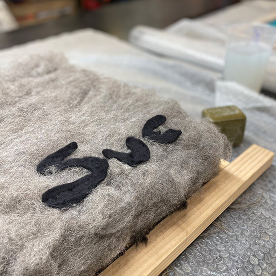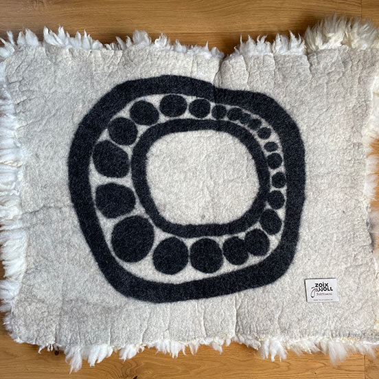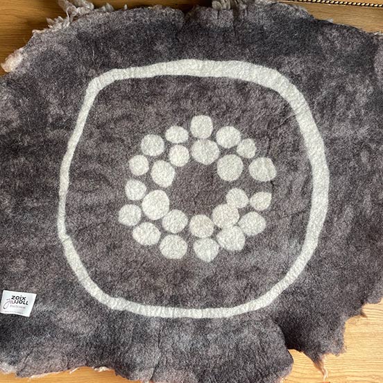 Ein Sitzkissen mit Walliser Schwarznasenlocken filzen.